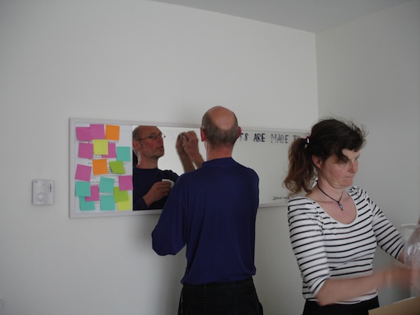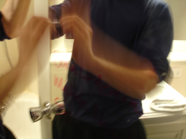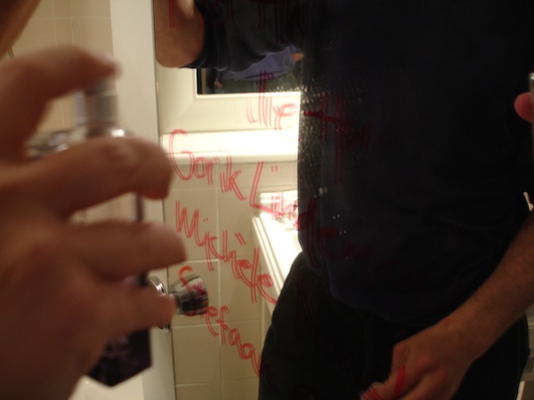 At 6pm we started breaking up room 107 with which ended this first official Laughter & Friendship Project. One tip for the Curator Emergency Kit – to remove red permanent marker from a mirror you need alcohol – a spray of eau indigo pour femme by Kenzo will also do if in need and so erasing the title and the list of participating artists from the bathroom door’s mirror became the final performance.