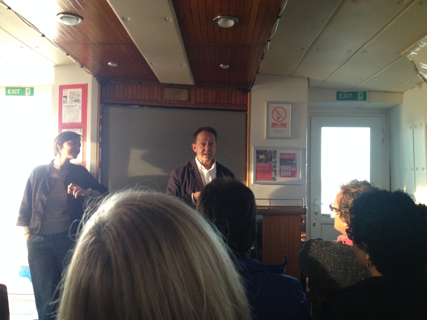 David Ward explains while film programme consultant Lucy Reynolds listens; Breda Beban’s Walk of the Three Chairs projected